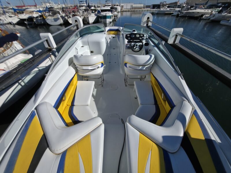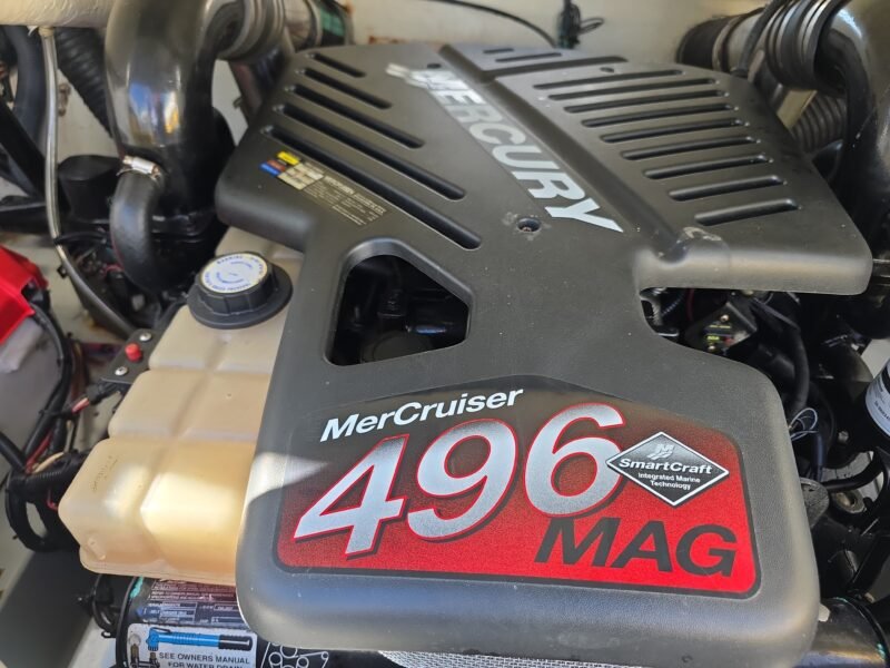 Este modelo destaca por su motor MerCruiser 496 MAG dentro-fueraborda de 370 HP, que la convierte en una lancha de altas prestaciones capaz de ofrecer una navegación ágil y fiable. Con un depósito de combustible de 380 l, está preparada para largas jornadas de navegación con la familia o amigos.