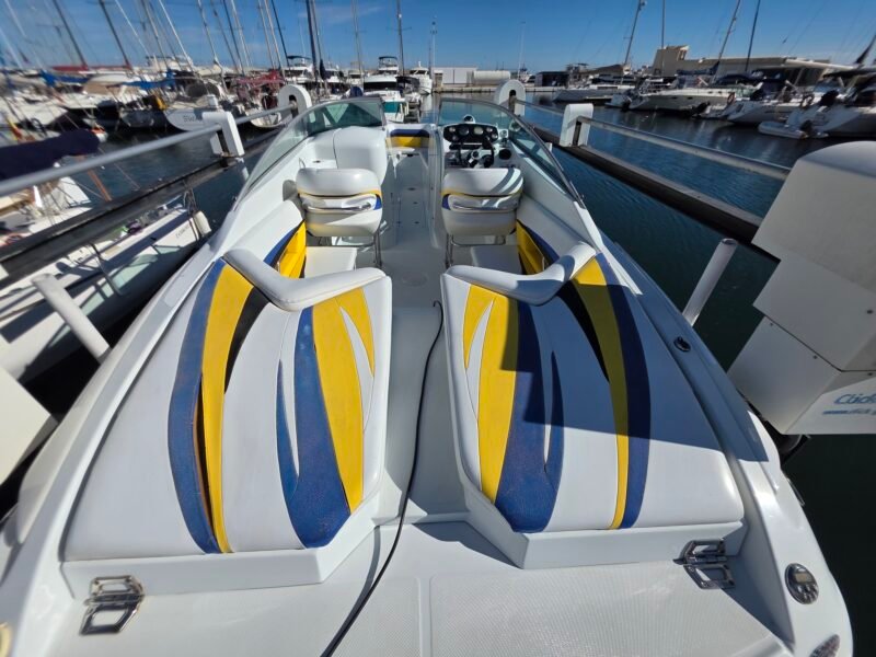 Bimini, cojines en bañera, flaps, altavoces para música en bañera, cargador de baterías, bomba de achique manual y bomba 12 V.