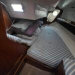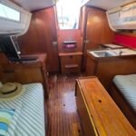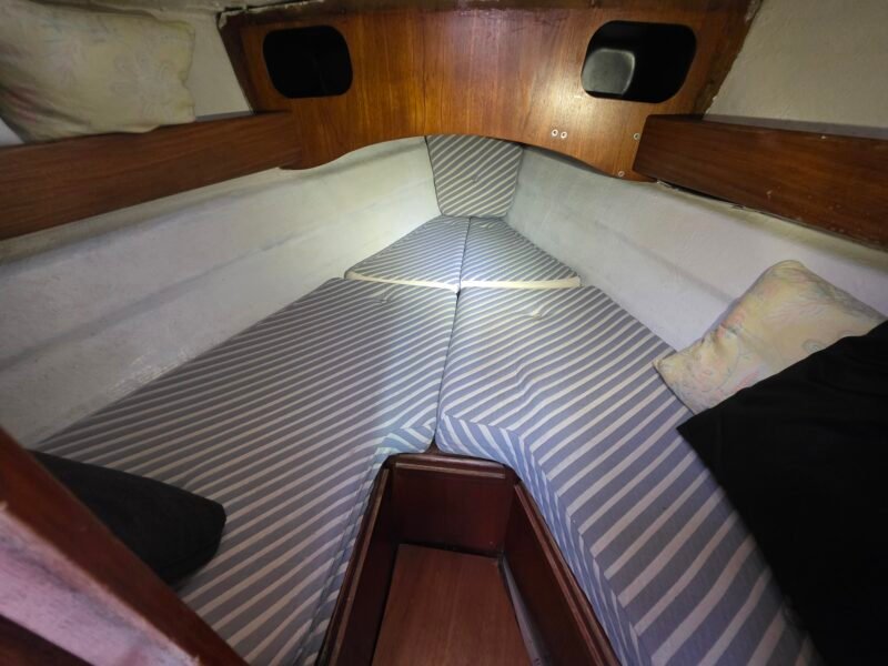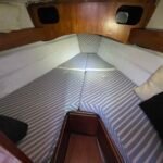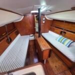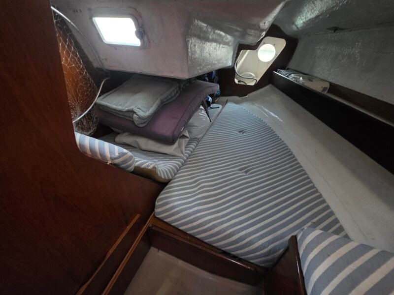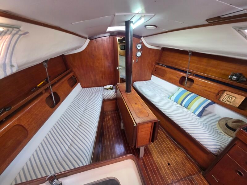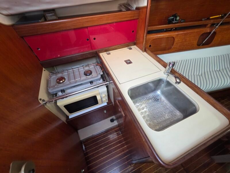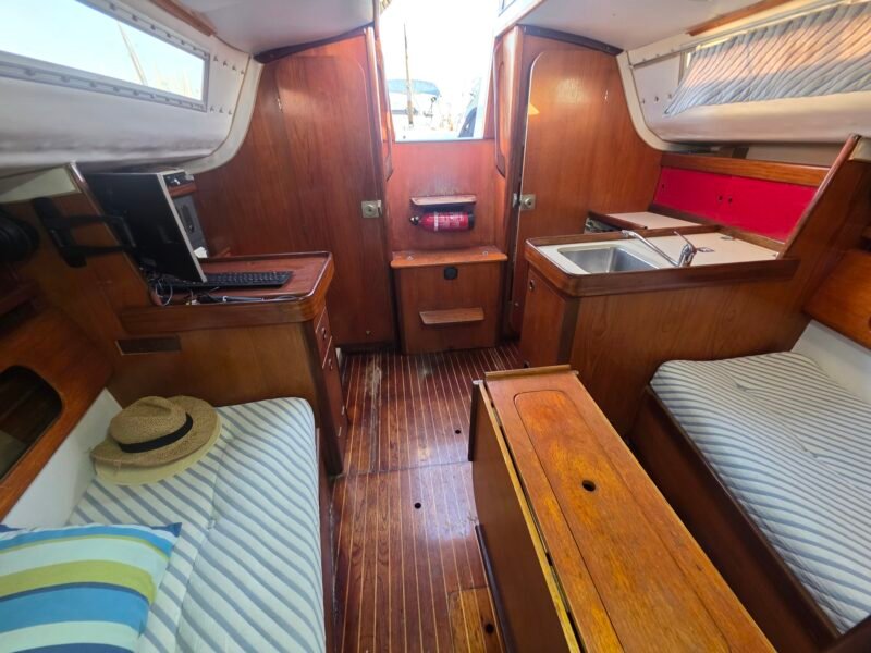 La cubierta antideslizante y los winches autoservicio facilitan la maniobra, mientras que la bañera amplia ofrece seguridad y control. El interior está bien aprovechado: camarote en proa, salón convertible, cocina práctica con fregadero y hornillo, armarios de estiba y WC químico de fácil mantenimiento. Dispone de escotillas y ventanillas con buen sellado, iluminación natural y eléctrica.