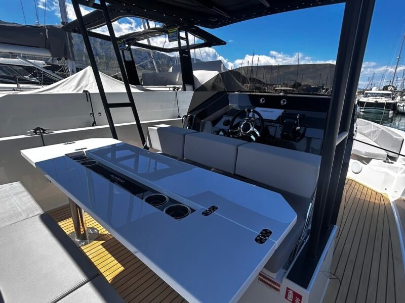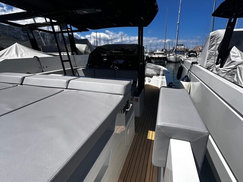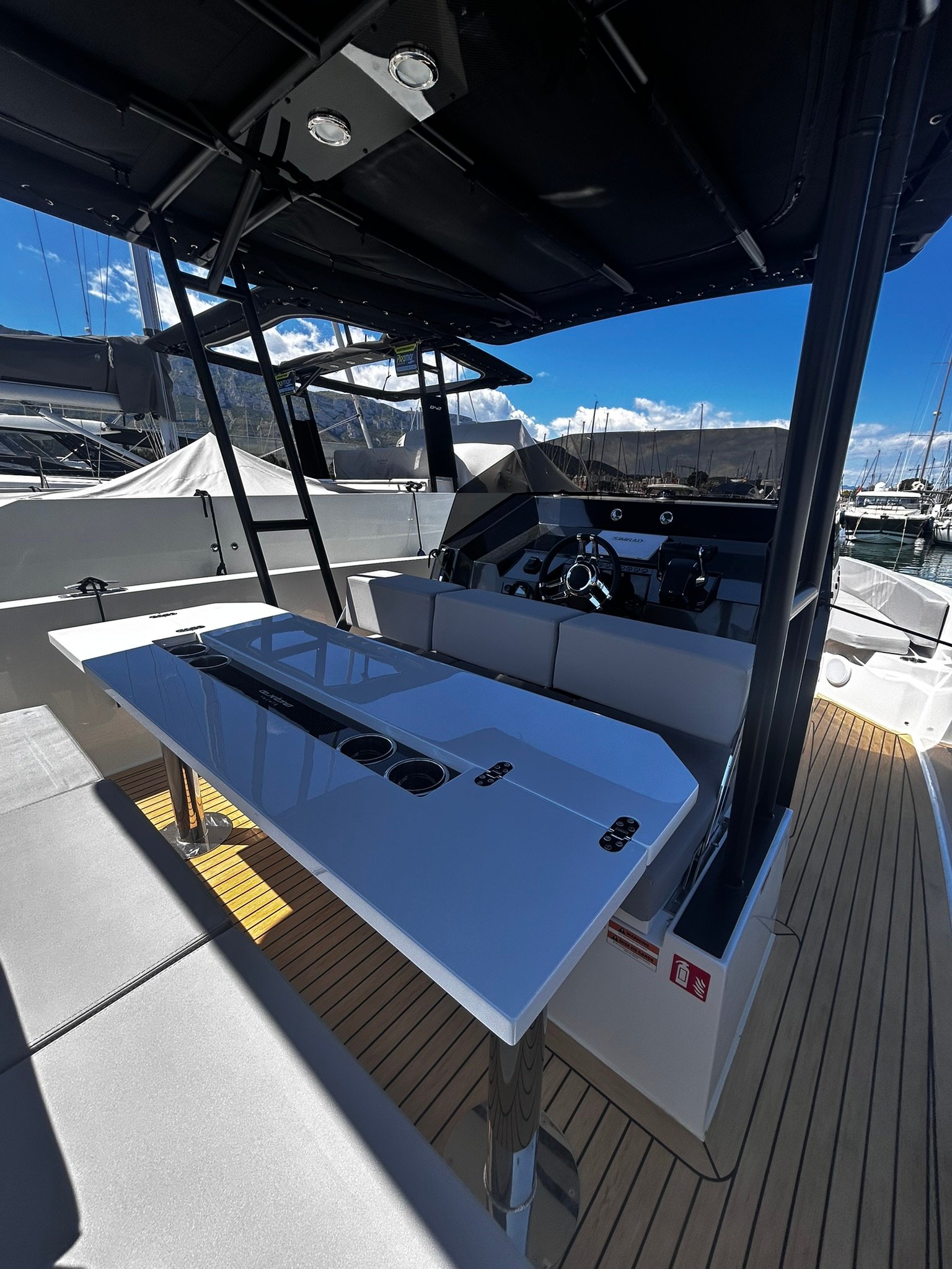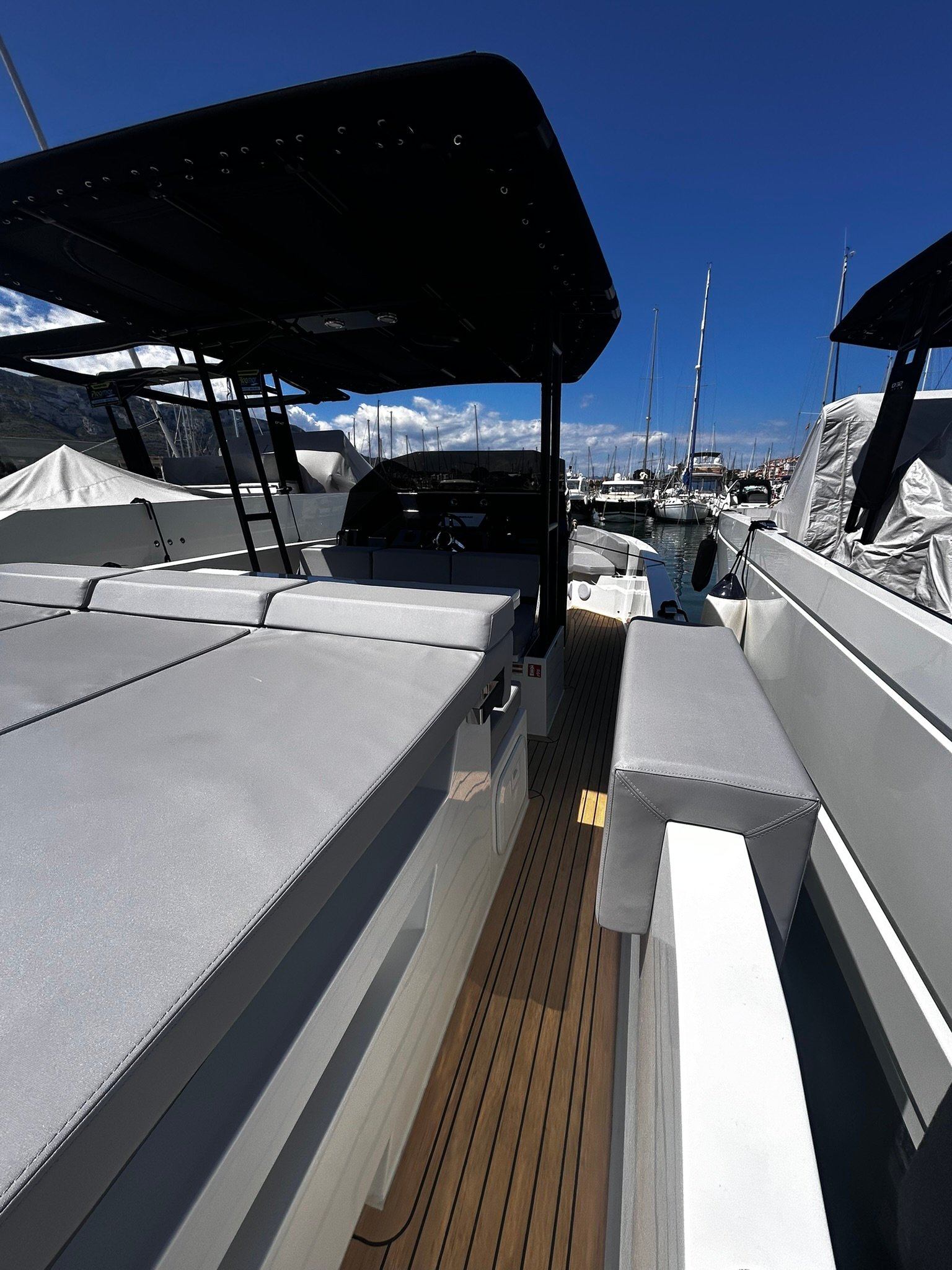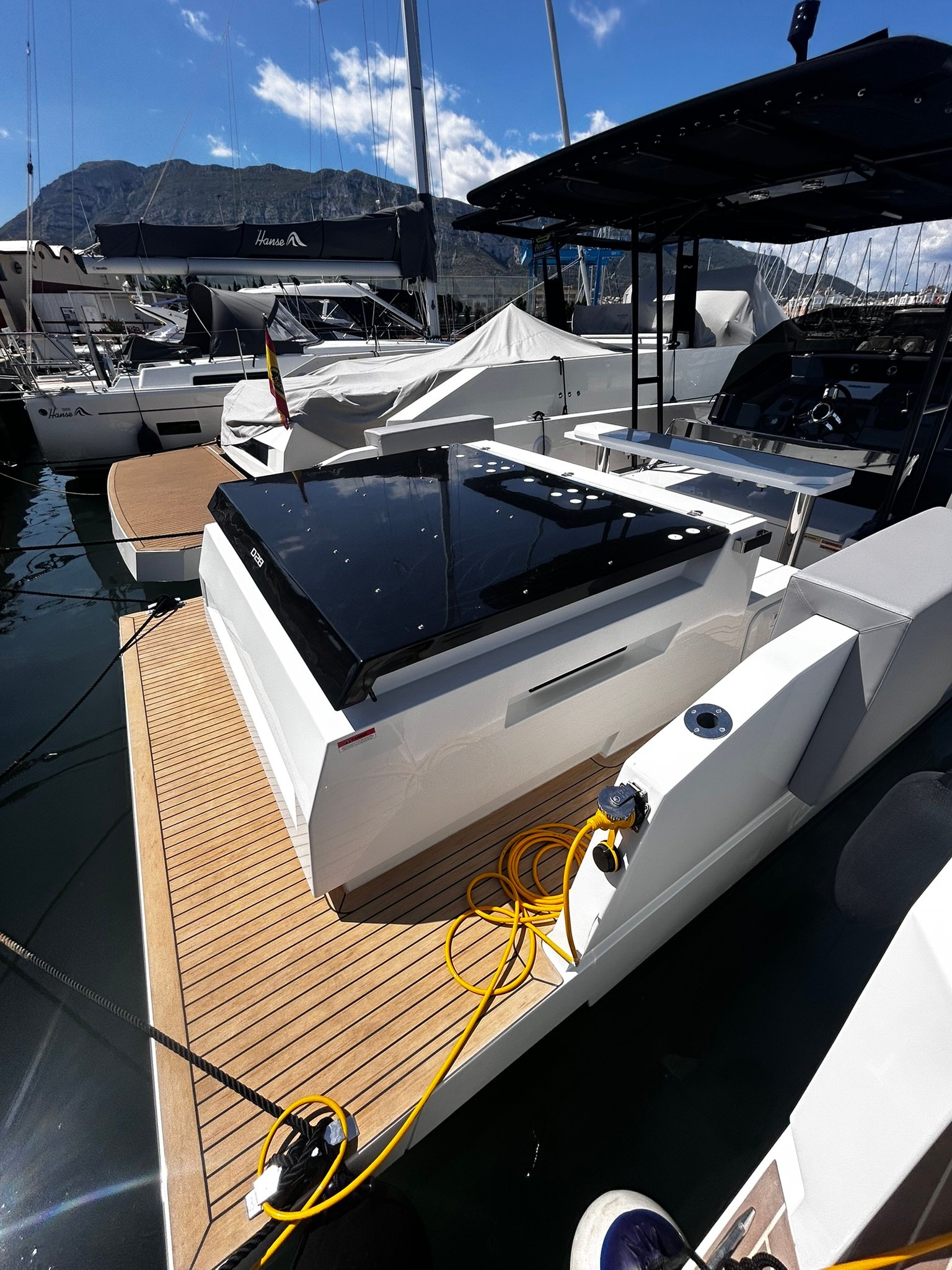 La distribución de los volúmenes permite una cómoda circulación periférica siguiendo el concepto “walk-around”. El D28 tiene toda la cubierta al mismo nivel ofreciendo diferentes zonas de solárium con asientos y mesas tanto a proa como a popa. El alto nivel de aprovechamiento del espacio es una sensación incomparable, con una capacidad máxima de hasta diez personas, el D28 es el barco de día ideal.