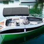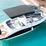 Casco blanco cojines color beige Solárium en proa Extensión de popa para solárium Rodillo de proa Bitas, ganchos remolque Pasamanos proa en Inox Escalera en Inox Bocina Luces de navegación Luces de cortesía Luz de fondeo Toma corriente 12V Plataformas traseras Desconectador de baterías Sistema eléctrico completo Brújula Bomba de achique