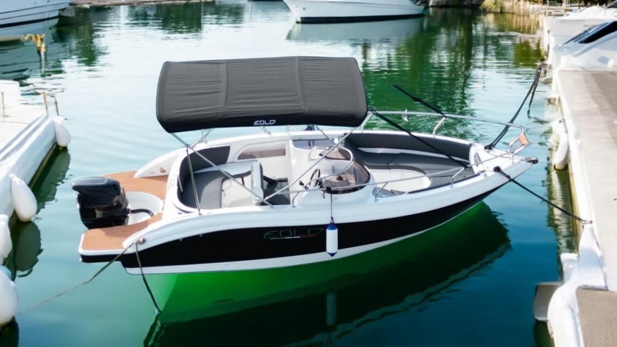 Casco blanco cojines color beige Solárium en proa Extensión de popa para solárium Rodillo de proa Bitas, ganchos remolque Pasamanos proa en Inox Escalera en Inox Bocina Luces de navegación Luces de cortesía Luz de fondeo Toma corriente 12V Plataformas traseras Desconectador de baterías Sistema eléctrico completo Brújula Bomba de achique