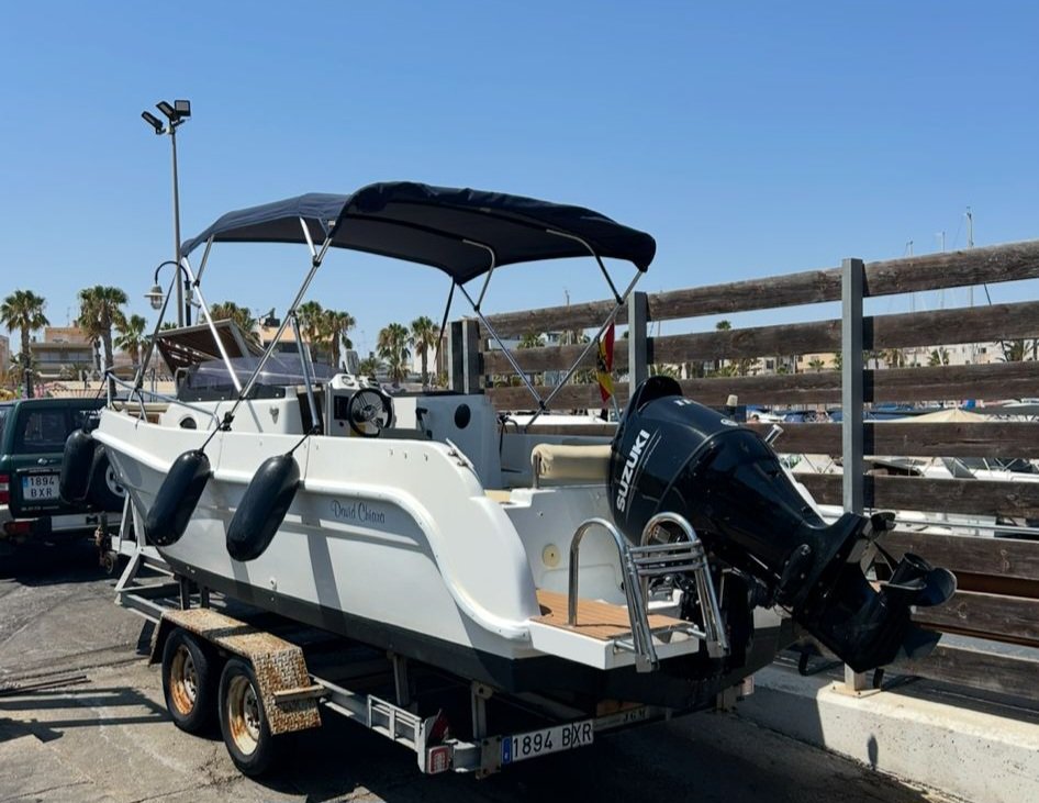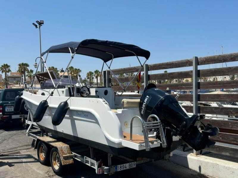 Barco a motor Fibresport OCRE 650 Sport, una embarcación versátil y funcional diseñada para disfrutar del mar tanto en salidas recreativas como en jornadas de pesca o paseos costeros. Con una eslora aproximada de 6,25 metros y una manga de 2,40 metros, ofrece una navegación estable y segura, impulsada por un motor fueraborda Suzuki de 115 HP que garantiza un buen rendimiento y una respuesta ágil en el agua.