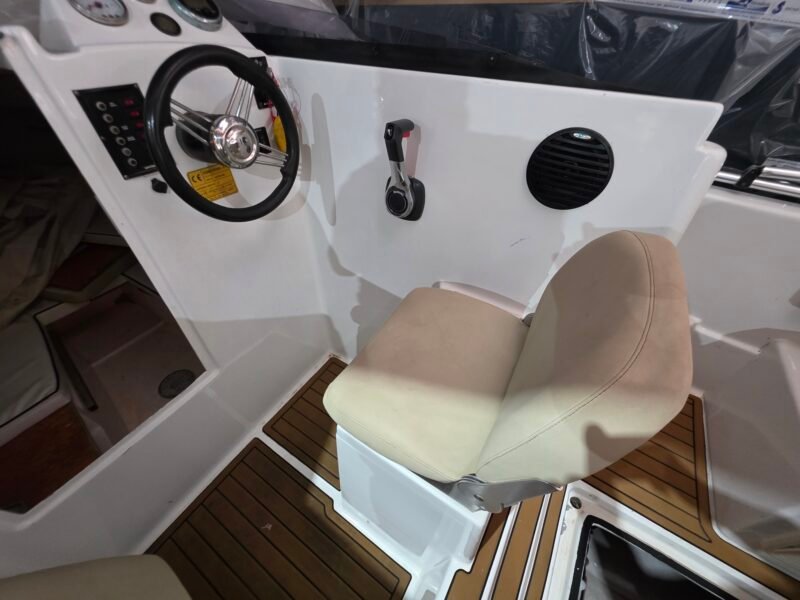 La distribución a bordo está pensada para aprovechar al máximo el espacio, contando con un camarote con dos literas que permite realizar escapadas de fin de semana o descansar cómodamente durante las salidas. En cubierta dispone de un diseño práctico y despejado, ideal para moverse con comodidad y disfrutar de la navegación.