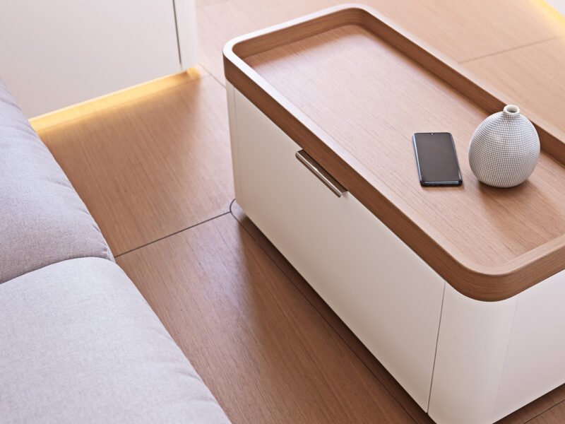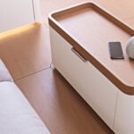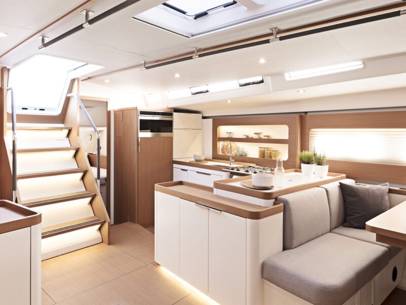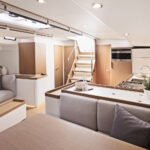 Es el gran retorno de la madera moldeada, material noble con acabados repulidos, sobre fondo de mamparos lacados y suelo en teca para el espacio interior del First 53 que no se ve demasiado extremo en su modernidad. Regalas y pasamanos, estibas completas componen el interior dotado de tres camarotes dobles y dos aseos La innovación mayor de este interior reside en el rincón salón/descanso, dotado de un sofá con mesa baja, separado del espacio cocina equipado con una mesa para cenar. El conjunto es luminoso, aireado y comunica fácilmente con el exterior por un descenso fácil e intuitivo.