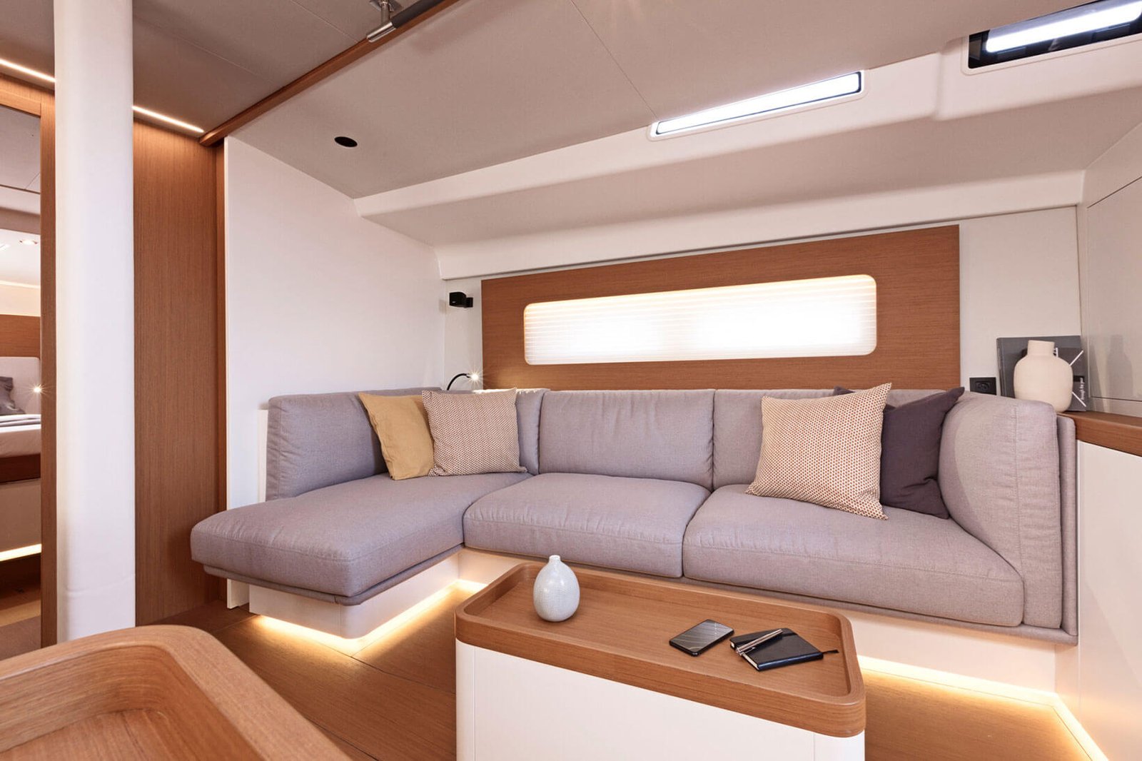 Es el gran retorno de la madera moldeada, material noble con acabados repulidos, sobre fondo de mamparos lacados y suelo en teca para el espacio interior del First 53 que no se ve demasiado extremo en su modernidad. Regalas y pasamanos, estibas completas componen el interior dotado de tres camarotes dobles y dos aseos La innovación mayor de este interior reside en el rincón salón/descanso, dotado de un sofá con mesa baja, separado del espacio cocina equipado con una mesa para cenar. El conjunto es luminoso, aireado y comunica fácilmente con el exterior por un descenso fácil e intuitivo.