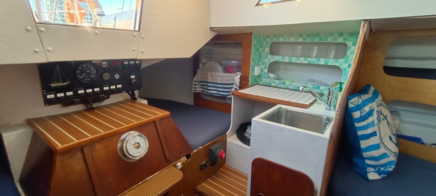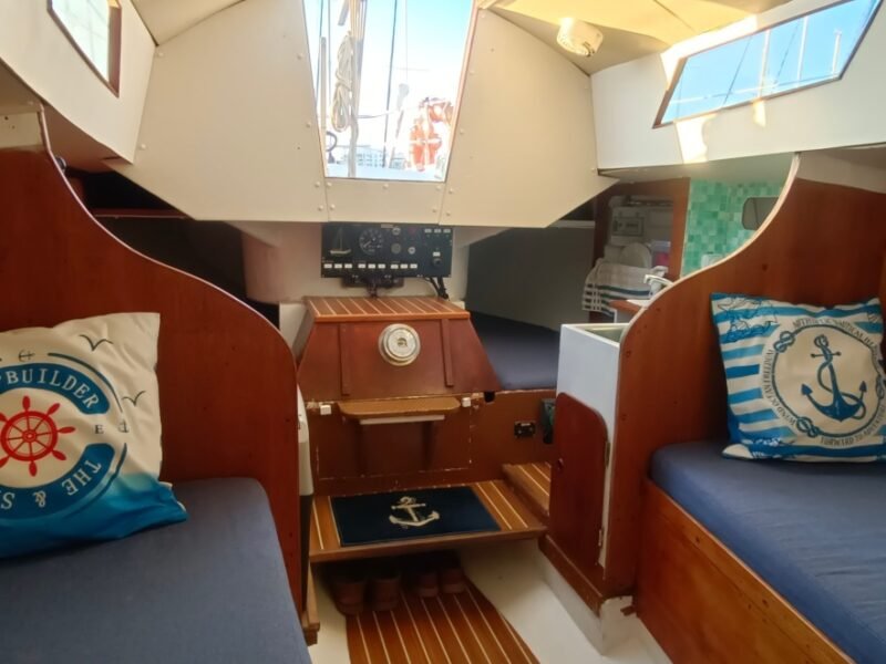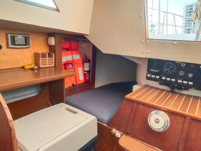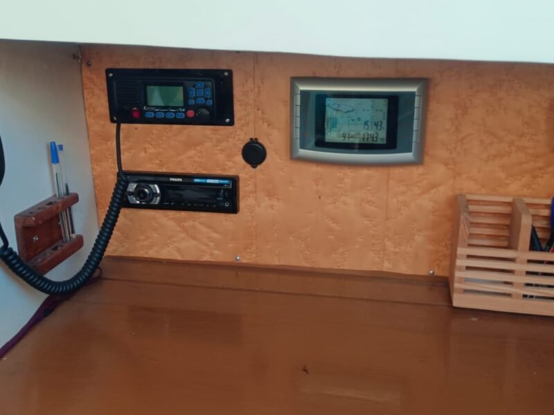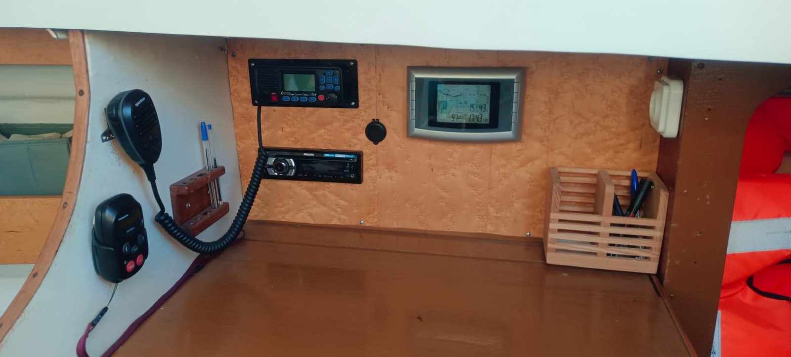 Alojamiento Categoría B6 Bandera Española Reserva de agua de 50 litros WC seco Luces interior LED Circuito 220V con enchufe de puerto Cargador de baterías 2 baterías Exide “Marine & Leisure” Dual AGM EP800 95AH 800W (1 de motor y 1 de servicio) Smartshunt BlueTooth Victron para el monitoring del consumo y carga de las baterías en tiempo real Estación meteo Barómetro Radio/CD Bluetooth Philips con altavoces estéreo en la cabina y en la bañera Enchufes USB Equipo mecánico Motor Sole Diesel Mini-17 cambiado en 2011 Hélice de 3 palas cambiada en 2022 Tanque de gasoil/diesel de 45 litros Equipamiento del casco y la cubierta Anemómetro Sonda de profundidad Sistemas de navegación Plotter Garmin GPS Map 922xsPantalla Garmin GNX20Pantalla Garmin GMI20VHF Sportnav SPO380MGAIS Garmin AIS-600 (receptor y transmisor) Piloto automático Raymarine con control remoto Radiobaliza satelital Cospas-Sarsat Kannad Safelink Sportpro+ (despachado para la zona 4) Equipamiento adicional Material de seguridad zona 4 completo y al día Despachado zona 4 hasta Octubre 2027 Último Antifouling hecho fin de Mayo 2025, válido para 2 años (3 capas)