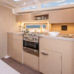 Deportado a babor el salón integra una tumbona y una mesa confortable para seis, frente a la cocina a lo largo.
