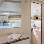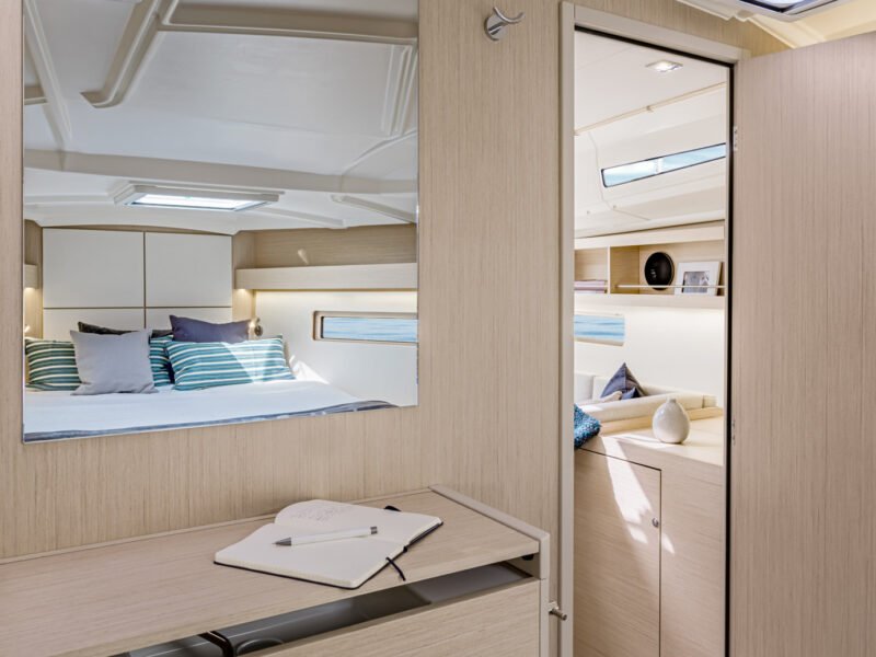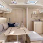 En un fondo de nogal o roble, el interior firmado por el gabinete de diseño italiano Nauta, brilla por su gran claridad y la ingeniosa disposición de los espacios habitables. Dos, tres o cuatro camarotes y a estribor, una cocina en C que ofrece múltiples estibas y un generoso plano de trabajo. A babor, el amplio salón y su mesa disponen de un banco movible, y la mesa de cartas al pie del descenso hace las funciones de un bello espacio de trabajo. Nada ha sido olvidado para que cada uno viva a merced del viento… y de sus deseos.