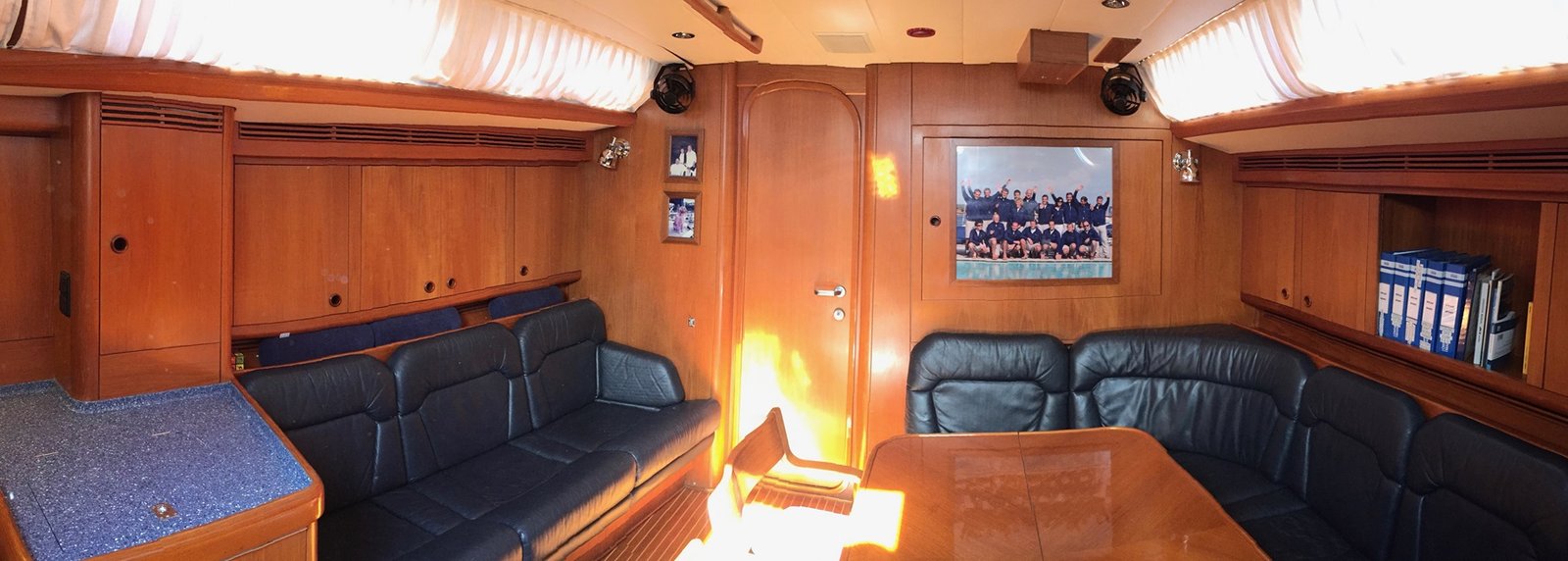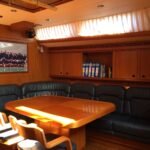 • Dinette with L-shaped sofa + 2 seats on the starboard side and 3-seater sofa on the left.
