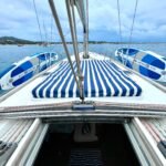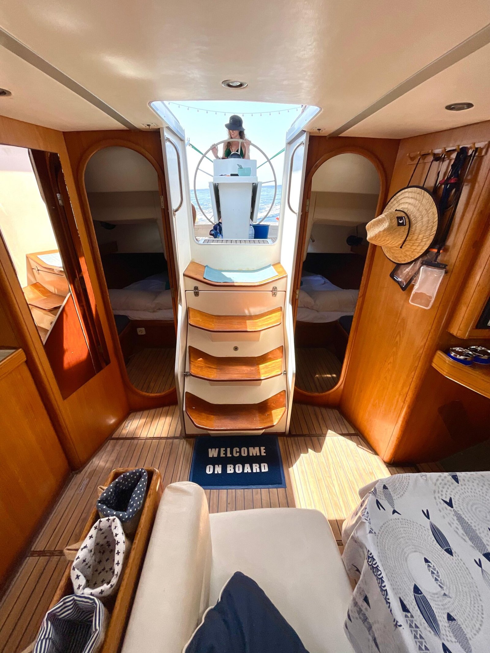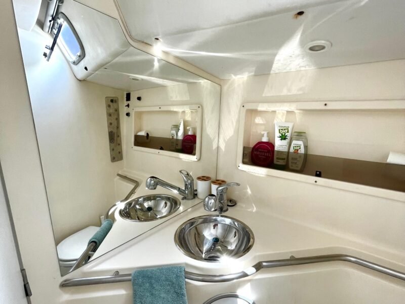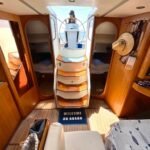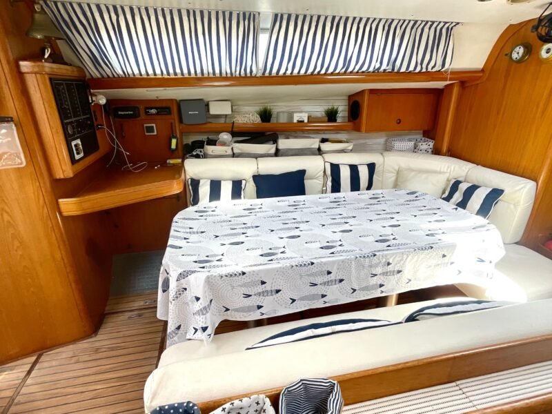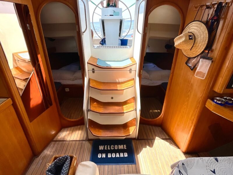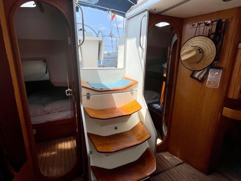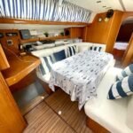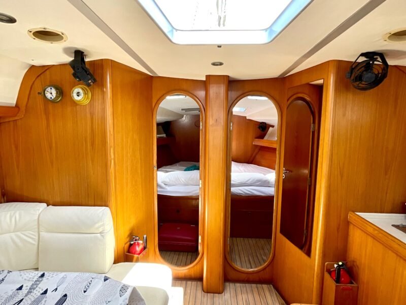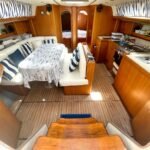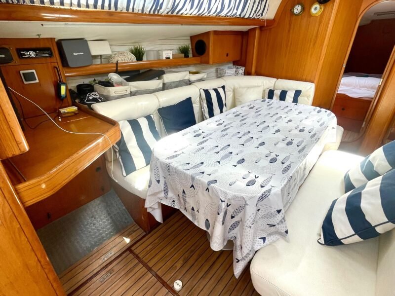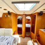 El interior está diseñado para maximizar el espacio habitable, con varias cabinas, zonas comunes amplias y una distribución funcional que favorece la vida a bordo. Cada detalle está orientado al confort de la tripulación, permitiendo una convivencia cómoda durante navegaciones prolongadas. Su casco sólido y bien proporcionado transmite confianza al timón y un comportamiento equilibrado en diferentes condiciones de mar.