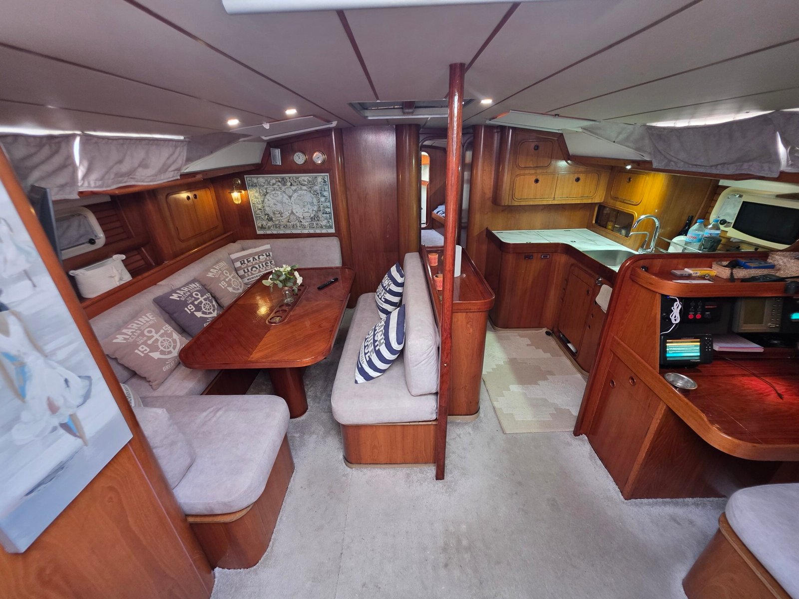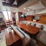 Con una eslora generosa y una manga que aporta gran estabilidad, el Oceanis 500 ofrece interiores espaciosos y bien distribuidos. El salón destaca por su luminosidad, ventilación y comodidad, creando un ambiente acogedor para la convivencia. La distribución interior permite alojar cómodamente a tripulación y invitados, con cabinas amplias y zonas comunes pensadas para el confort diario.