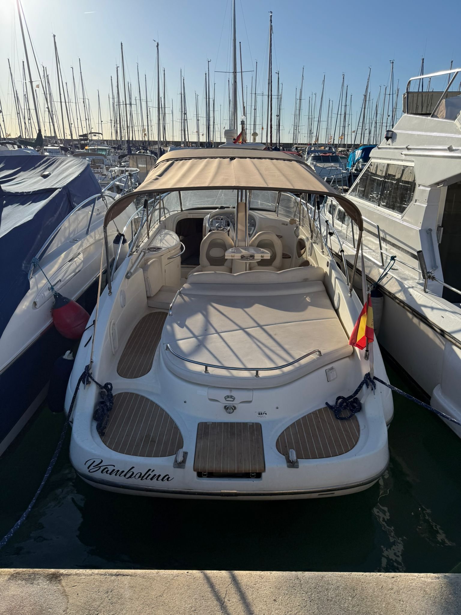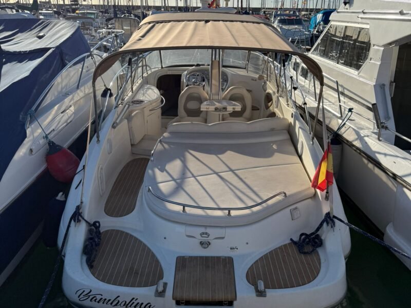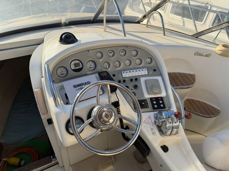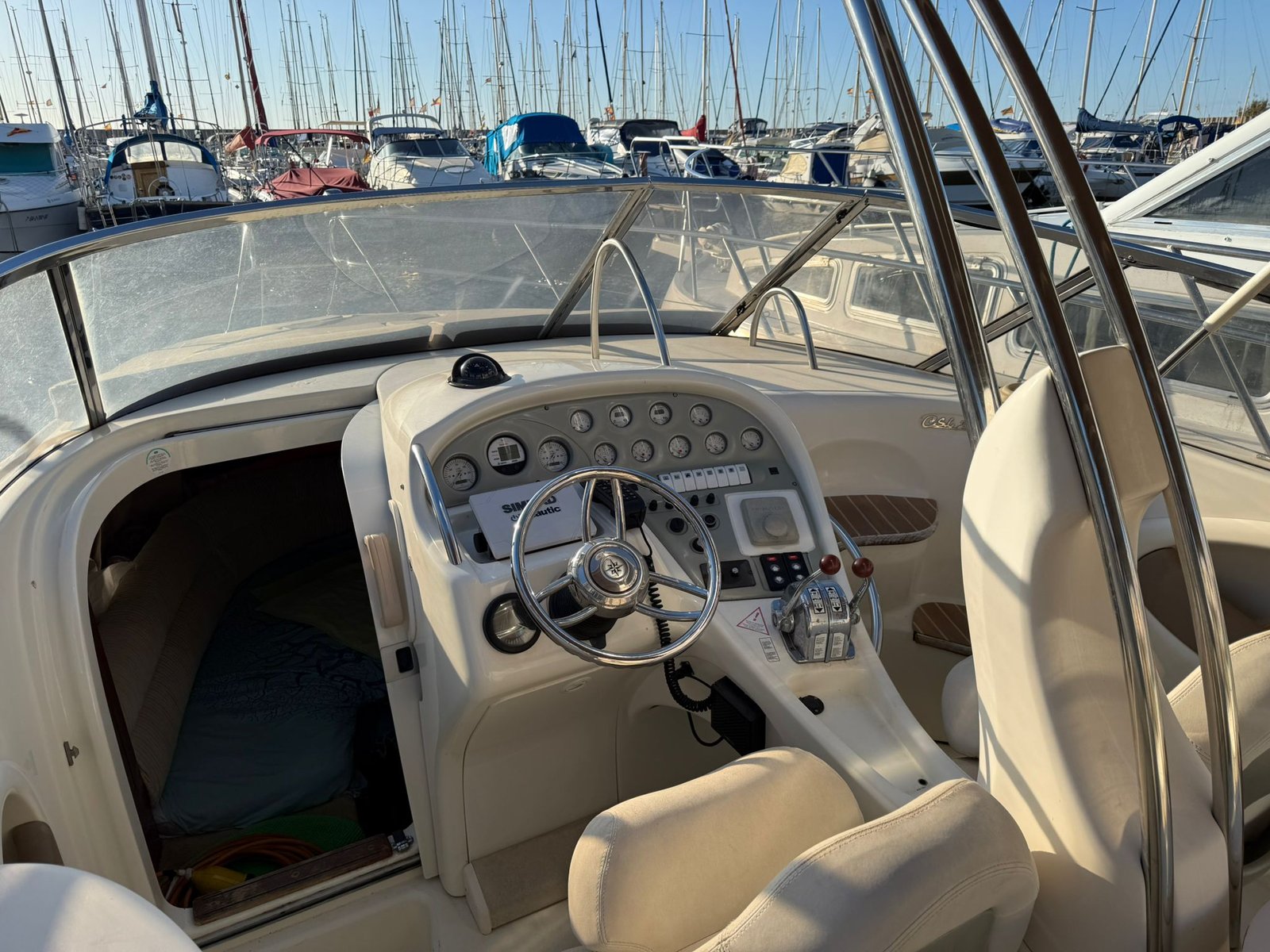 1 Cabina 1 Baño, WC eléctrico, GPS Plotter Simrad nuevo, Emisora VHF Simrad nueva, Equipo Audio Fusion Bluetooth, 4 Altavoces exteriores, Conexión 220V, Cargador de baterías 220V, Nevera eléctrica Isotherm, Cocina eléctrica, Luces de navegación, Bocina nueva 2025, Solárium proa y popa, Ducha exterior, Faro pirata, Toldo Bimini largo, Bichero, Material de seguridad, Escalera de baño, Flaps Zipwake nuevos, Homologado para 8 plazas, Revisión motores y colas 2025, Antifouling julio 2025. Excelente estado.