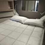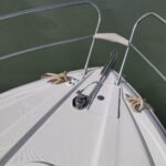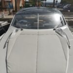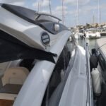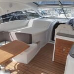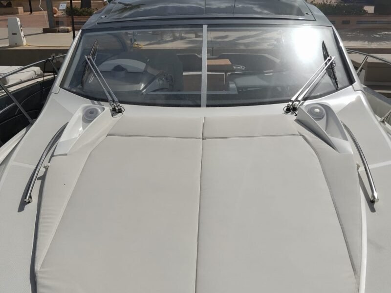 La bañera y los espacios exteriores están diseñados para el ocio y la diversión: bañera y plataforma en teca con junta negra, mesa de teca con altura regulable, solárium en proa, grill eléctrico en la bañera, nevera en la bañera y asientos tapizados confortables. La embarcación cuenta con un Bimini manual y personalizado, así como un Hard Top eléctrico con panel de cristal para sombra y protección.