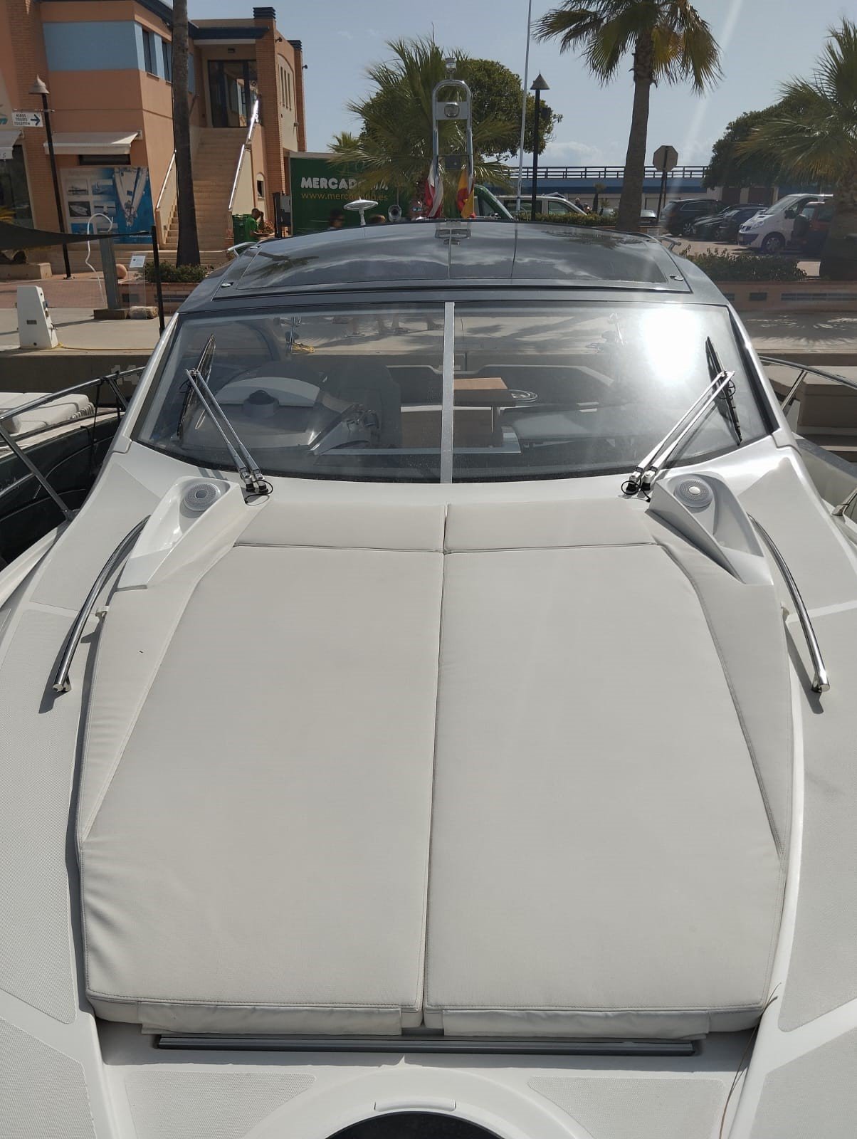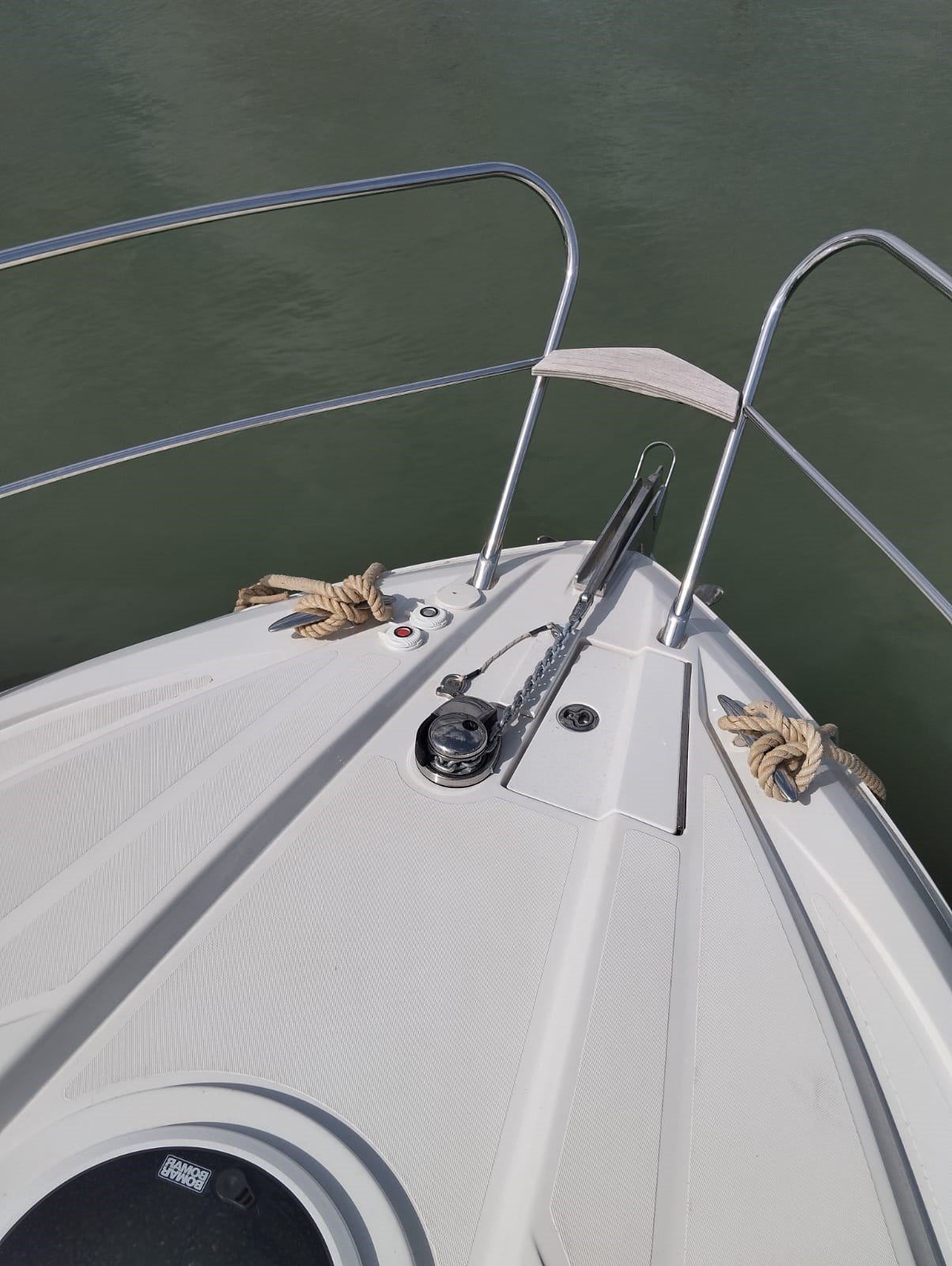 La bañera y los espacios exteriores están diseñados para el ocio y la diversión: bañera y plataforma en teca con junta negra, mesa de teca con altura regulable, solárium en proa, grill eléctrico en la bañera, nevera en la bañera y asientos tapizados confortables. La embarcación cuenta con un Bimini manual y personalizado, así como un Hard Top eléctrico con panel de cristal para sombra y protección.