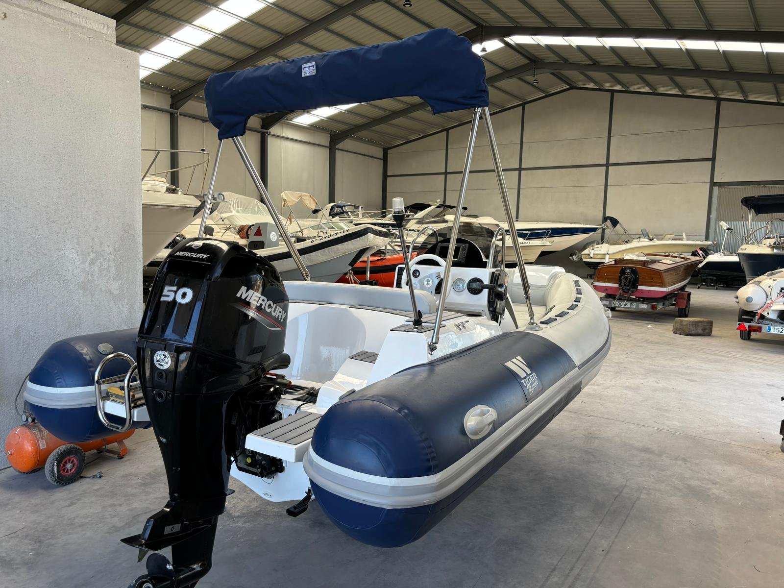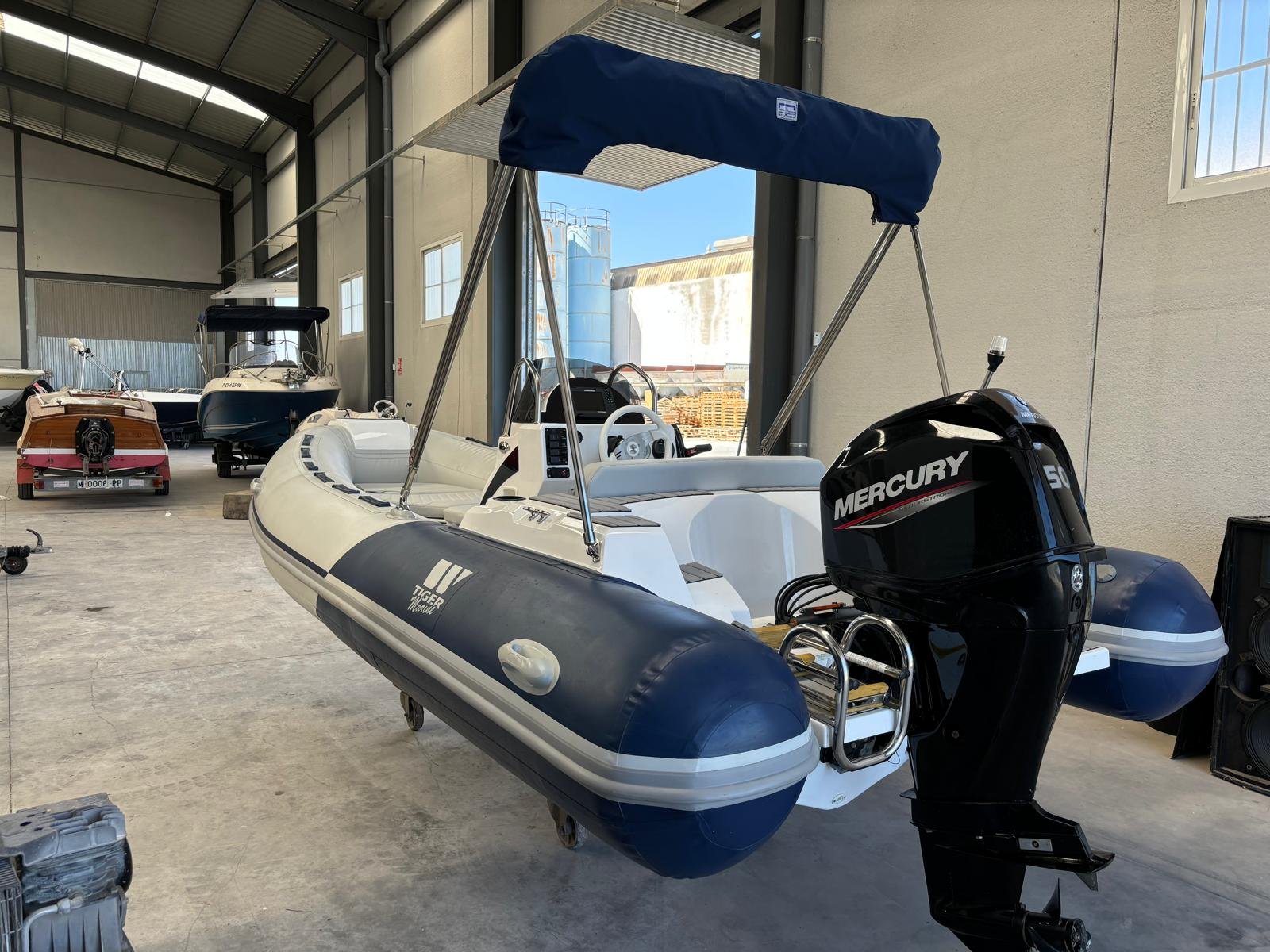 Tiger Marine 480 — semirrígida compacta, práctica y muy manejable. Con 4,80 m de eslora y equipada con un motor Mercury F50 de 50 CV, esta embarcación ofrece un rendimiento equilibrado para navegación costera, pesca ligera y salidas recreativas. Homologada para 8 personas, permite disfrutar del mar con comodidad gracias a su diseño estable y su casco pensado para facilitar el planeo incluso con mar moderada.