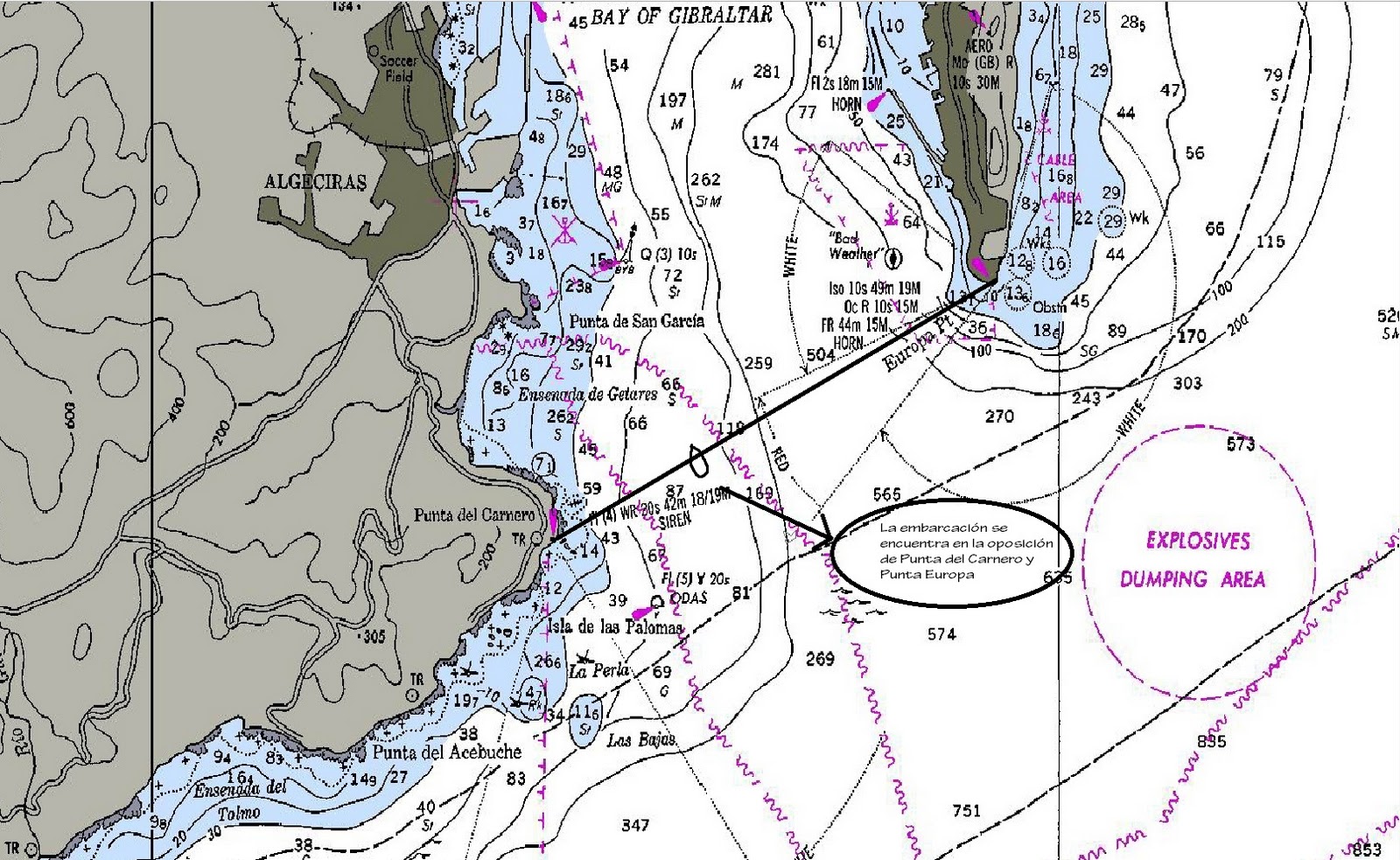 Como vemos en la foto, en la escala de las latitudes, hemos medido 3 millas (en rojo) y luego lo hemos pasado a Punta Europa para cortar la recta y decirnos exáctamente donde nos encontramos, después veríamos la posición exacta en la escala de las latitudes y las longitudes y ya estaremos situados.