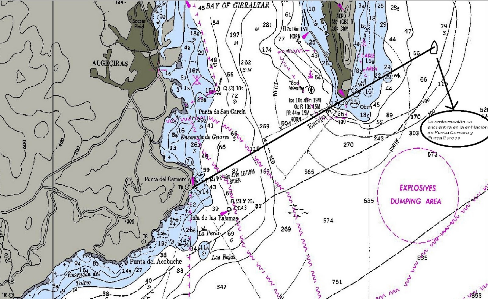 Nos podríamos situar en la carta, sabiendo que estamos en la oposición o enfilación, y sabiendo la distancia que estamos de uno de los dos puntos que trazan la recta.
